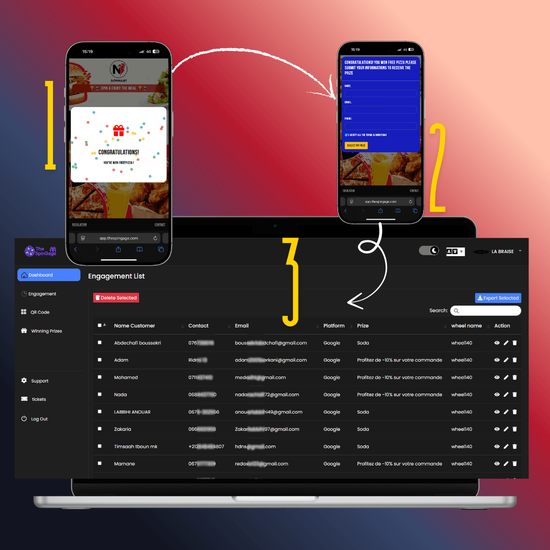 Merchants sign up onΒ TheSpinGage, customize their campaign (colors, logo, prizes), and get a QR code to share in-store or online. Every interaction provides data insights and improves customer engagement and loyalty.